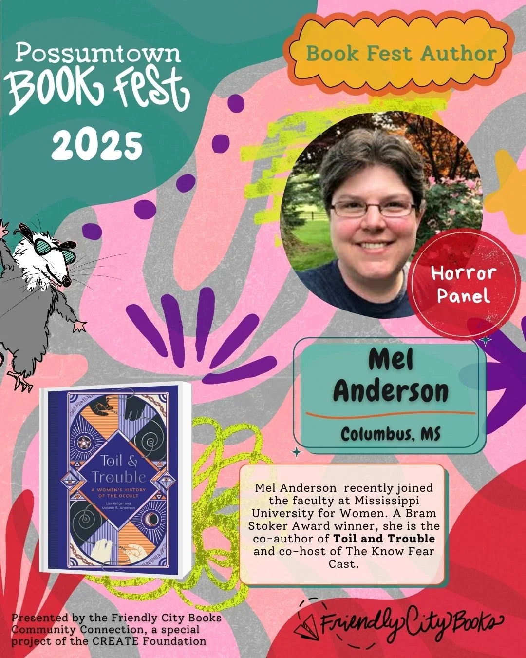 Mel Anderson (Columbus, MS) recently joined the faculty at Mississippi University for Women. A Bram Stoker Award winner, she is the co-author of Toil and Trouble and the co-host of The Know Fear Cast.