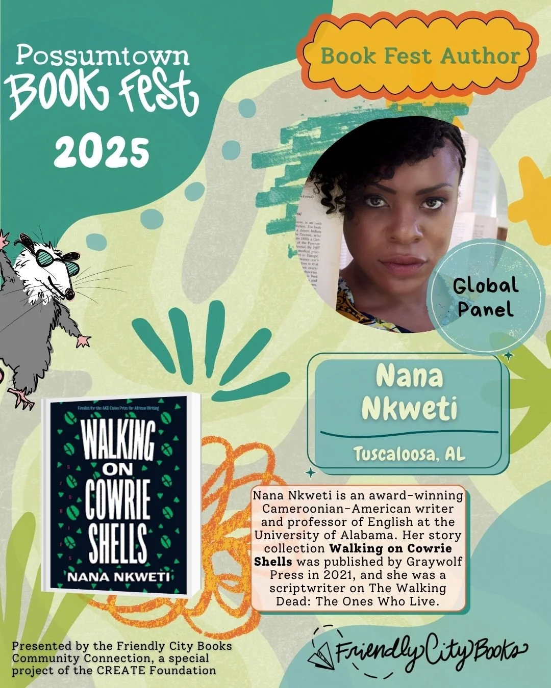 Nana Nkweti (Tuscaloosa, AL) is a Cameroonian-American writer and professor of English at the University of Alabama. The winner of the Whiting Award and a finalist for the Caine Prize for African Writing, her debut short story collection Walking on Cowrie Shells was published by Graywolf Press in 2021, and she was a scriptwriter on The Walking Dead: The Ones Who Live.