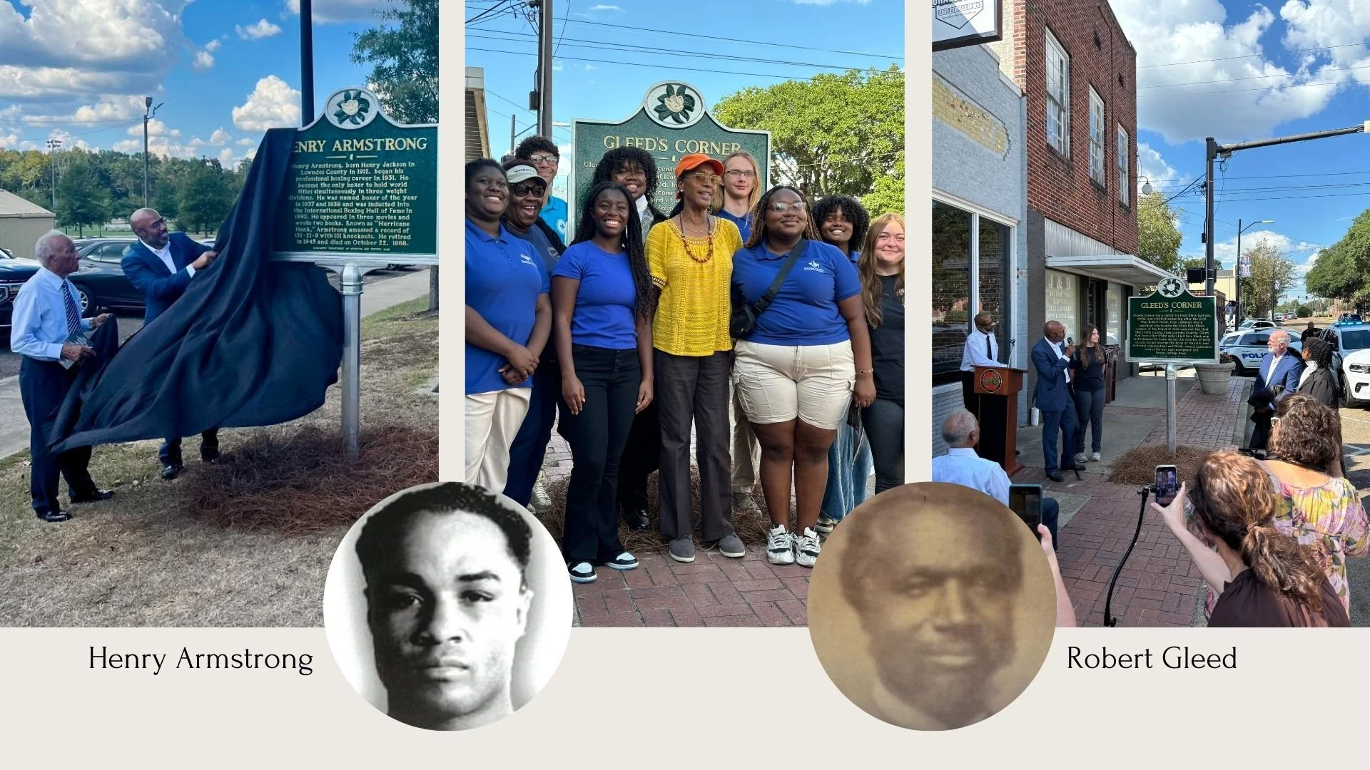As I listened to a high school student tell Gleed’s story, I was startled to hear the parallels with the story I’ve come to learn about Emmett Till’s final night—how hatred appeared in the middle of the night busting through the door of a place they were meant to be safe. And then I looked around at the crowd on Gleed’s Corner, his namesake, and noticed who had come to pay their respects: Black and White elders sitting together, Black and White students wearing matching shirts from the local boarding school they all attend together, the current Black mayor and the former White mayor applauding the reveal of the new monuments. I don’t think it was lost on anyone that the new sign for Gleed’s Corner sits catty-corner from the Lowndes County Courthouse lawn and the spot where the Confederate monument once sat. (To our knowledge, it was the first in Mississippi to be relocated.)