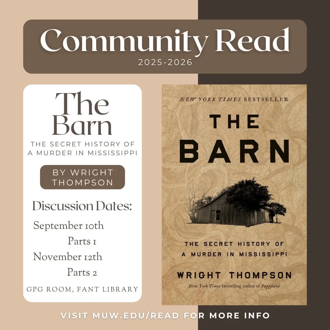 Join the community for the first in a series of book talks about The Barn by Wright Thompson, at the MUW Fant Memorial Library’s Gail P. Gunter Multi-Purpose Room. The Community Read leaders and the community will be discussing Section I of the book. Copies of the book will be available to first attendees present.