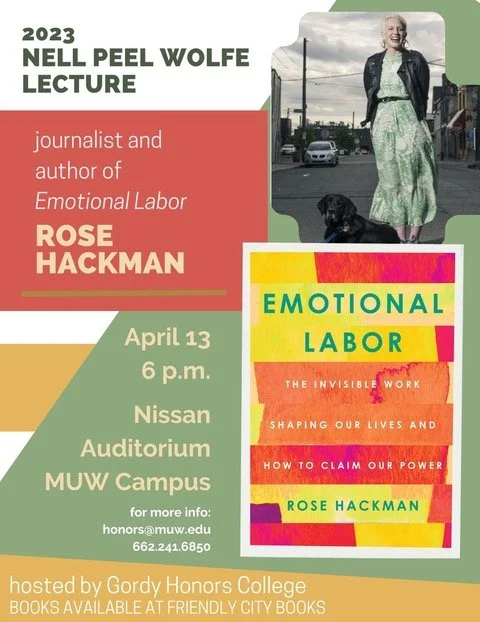 Join us as Rose Hackman, author of Emotional Labor, delivers the annual Nell Peele Wolfe Lecture at Mississippi University for Women on Thursday, April 13, at 6 p.m. in Nissan Auditorium. This event is free and open to the public. Signed books will be available after the event in store at Friendly City Books and at friendlycitybooks.com/shop.