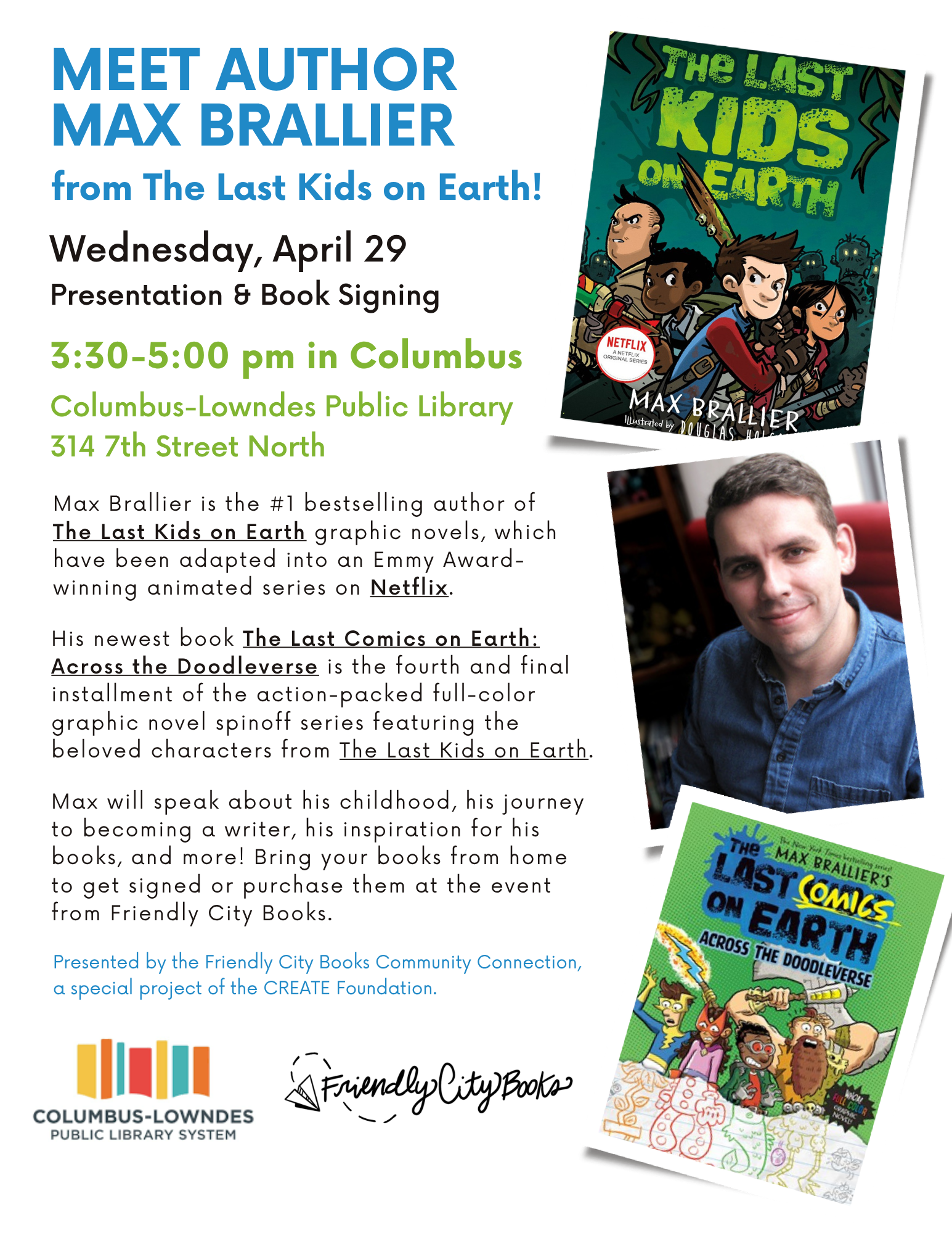Meet the Author: Max Brailler in Columbus Wednesday, April 29, 2026 5:00 PM 6:30 PM Columbus-Lowndes Public Library 314 7th Street North Columbus, MS, 39701 United States (map) Google Calendar ICS