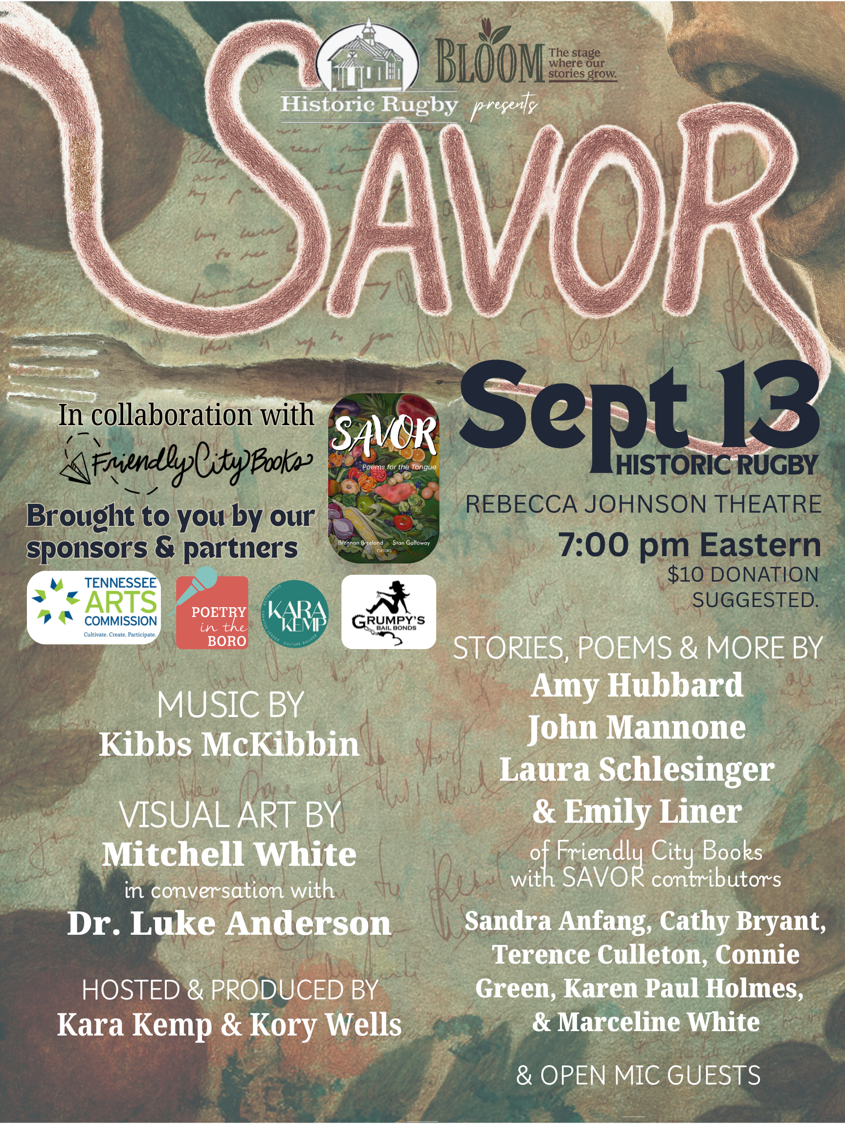 Historic Rugby is thrilled to present this special show, made possible through the generous support of a grant from the Tennessee Arts Commission. This expanded collaboration will feature select poets from the anthology sharing their work live on stage. Friendly City Books, based in Columbus, MS, will be on hand with copies of the anthology available for purchase. The performance begins at 7:00 PM Eastern Time (doors open at 6:30 PM).